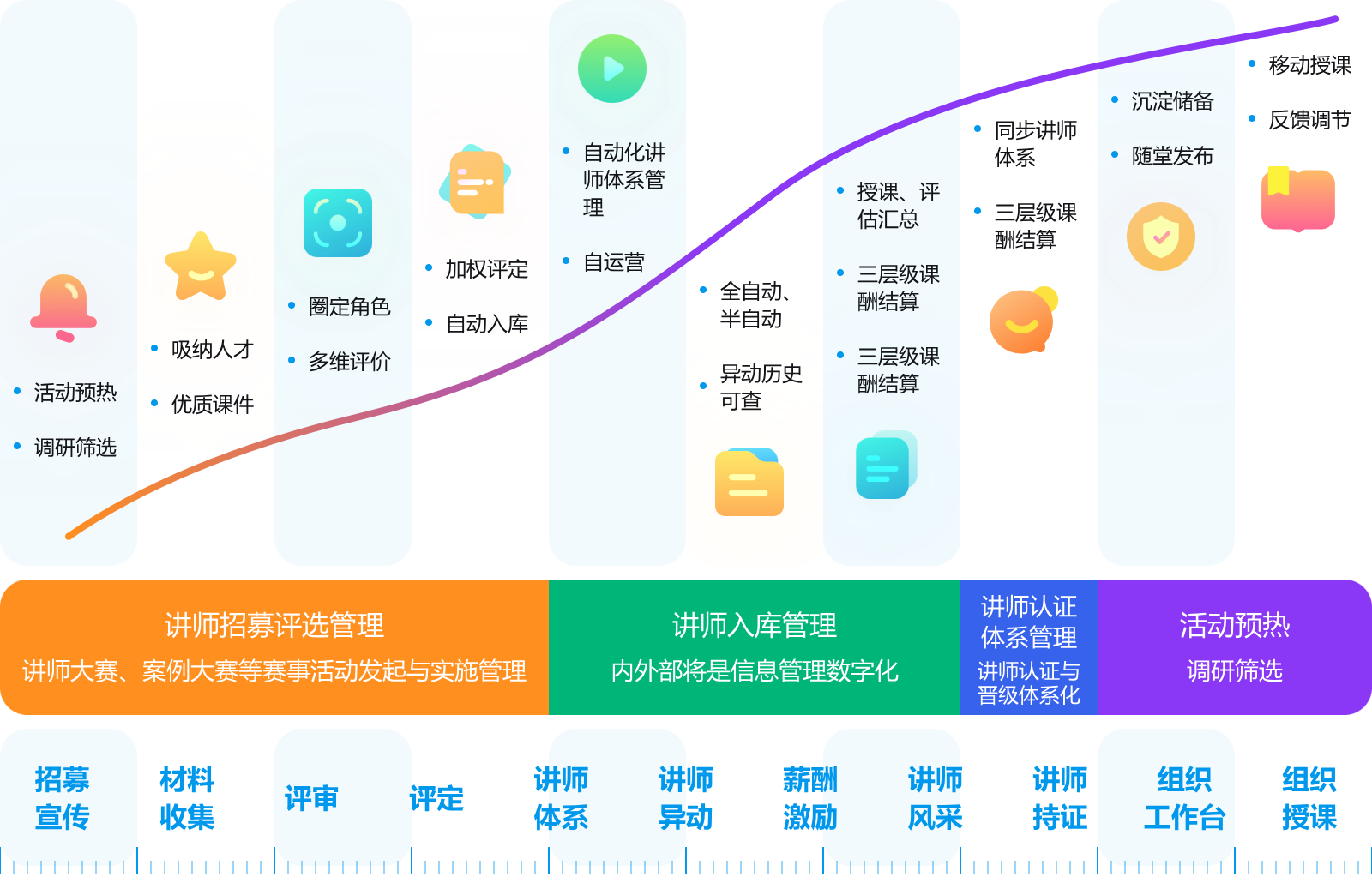1. 招募、认证、入库、考核、授课、统计全流程管理